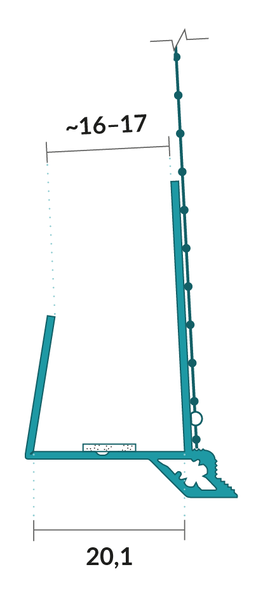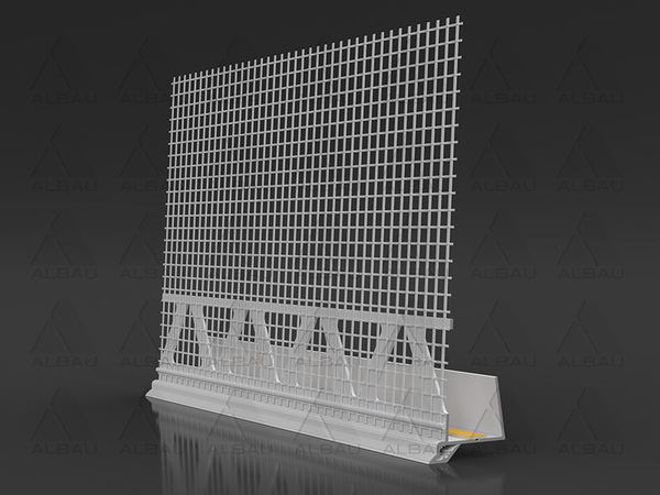 APU clip-on pvc profile W80-2020 for plaster-based boards with drip edge and mesh is used horizontally in thermal insulation composite systems, e.g. for plaster connections on roller shutter/venetian blind boxes. The cranked profile contour offers a safe solution for water flow downwards